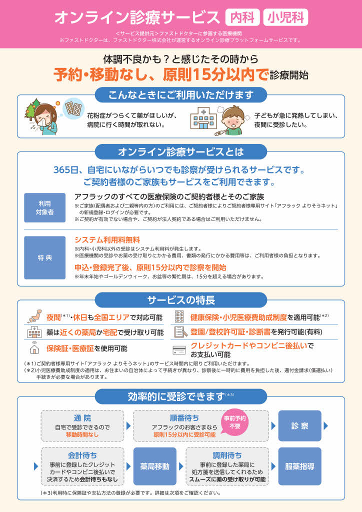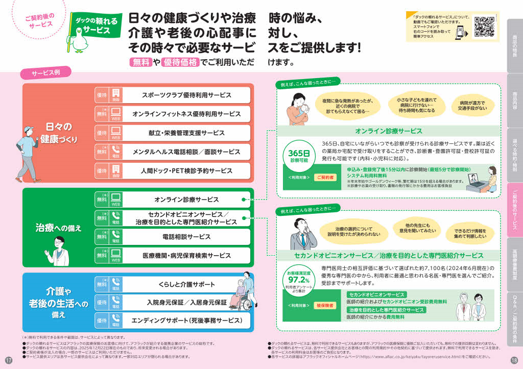 付帯サービス「ダックの頼れるサービス」が付いています。システム利用サービスが無料・最短5分で診療開始。健康や医療・介護に関する相談、病気やケガをした時の不安や悩みなどを幅広くサポートします。